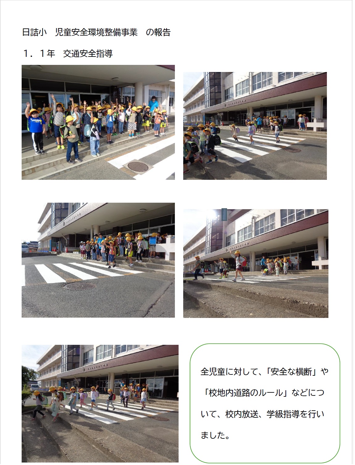 ・劣化が進んだ横断歩道等を再整備し、校地内での交通安全ルールについて再確認・指導する。